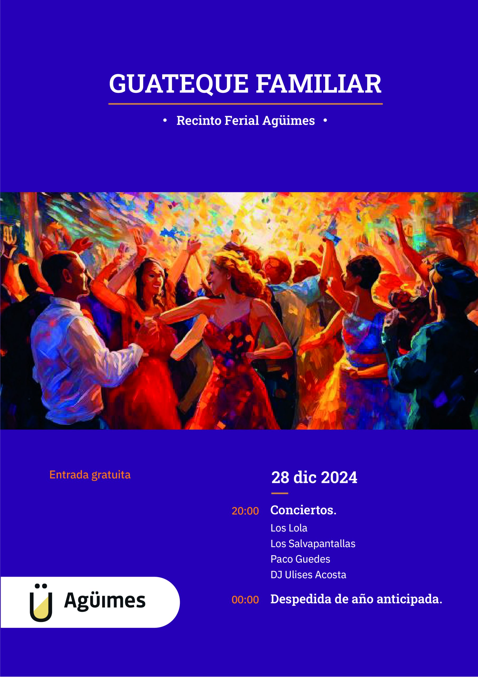 Los vecinos y vecinas del municipio de Agüimes podrán despedirse del año de manera anticipada en un guateque familiar, evento festivo que tendrá lugar este sábado 28 de diciembre, a partir de las 20:00 horas, en el Recinto Ferial, ubicado en el Cruce de Arinaga. La fiesta, de entrada gratuita, contará con las actuaciones de Los Lola, Los Salvapantallas, el cantante Paco Guedes y el Dj Ulises Acosta. Tras la velada musical, a las 00:00, se despedirá el año con una simbólica cuenta atrás.