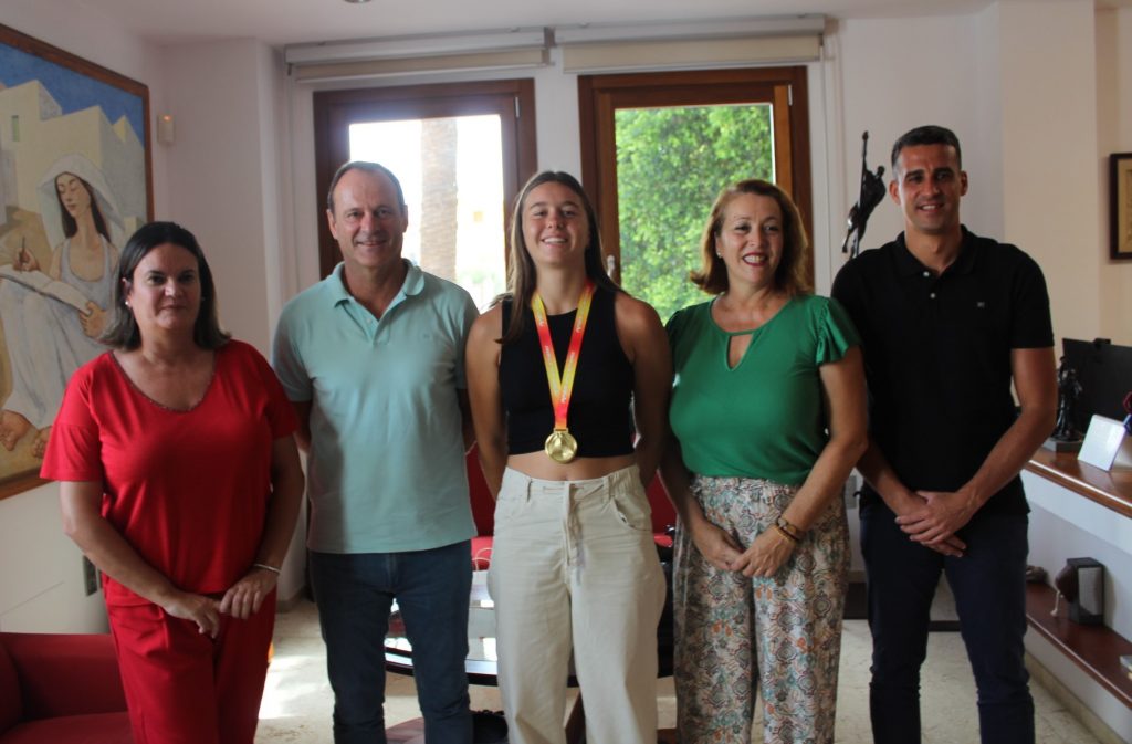 El Ayuntamiento de Agüimes agasajó este martes a la atleta Andrea Monroy por su reciente medalla de oro de heptatlón en el Campeonato de España de Atletismo Sub-18, celebrado el 6 y el 7 de julio en la ciudad de Málaga. La joven deportista, de tan sólo 17 años, fue recibida por el alcalde, Óscar Hernández, la teniente de alcalde, María Suárez, y el concejal de Deportes, Alberto Santana, quienes le hicieron entrega de una placa en recuerdo de su importante logro, que le supuso además su brillante clasificación para el Campeonato de Europa de Atletismo en su categoría de edad.