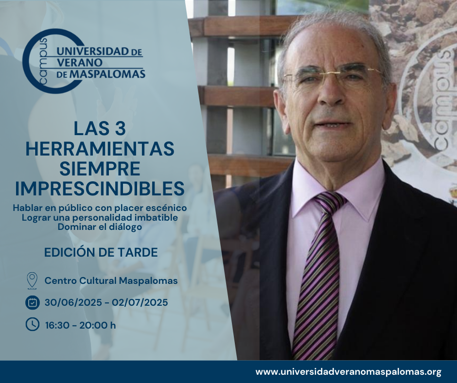 El experto en oratoria Ángel Lafuente regresa a la Universidad de Verano de Maspalomas con el exitoso curso ‘Las 3 herramientas siempre imprescindibles: hablar en público con placer escénico, lograr una personalidad imbatible y dominar el diálogo’, que impartirá del 30 de junio al 4 de julio, en horario de mañana y de tarde, en el Centro Cultural Maspalomas