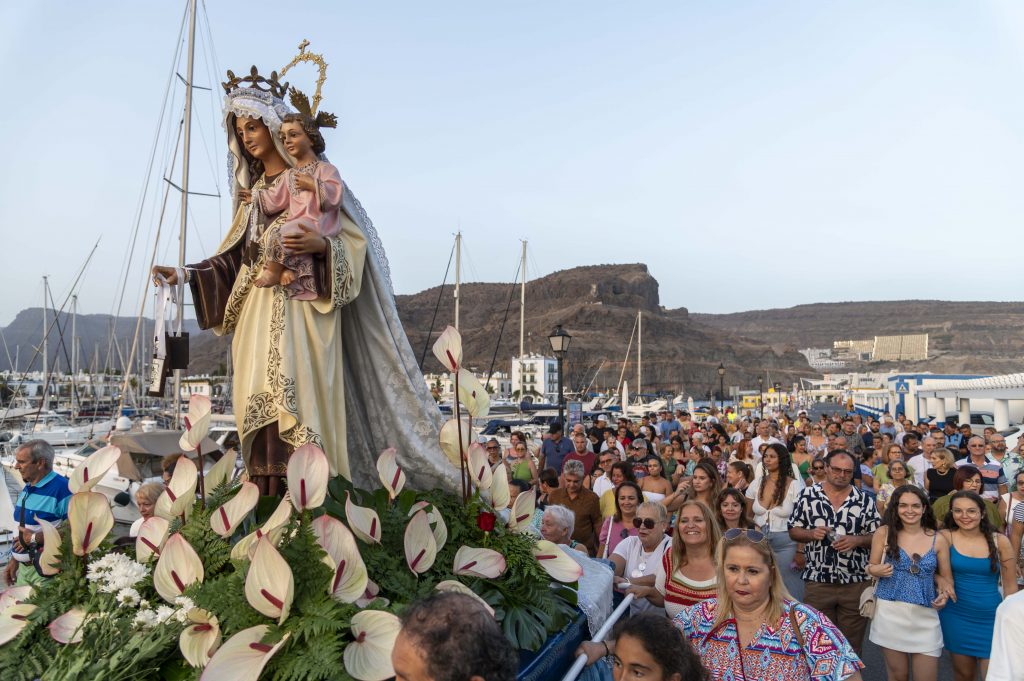 Los barrios celebraron de forma paralela las eucaristías en honor a la Virgen. En Playa de Mogán la ceremonia tuvo lugar en la plaza doctor Pedro Betancor León, desde donde a continuación partió la comitiva al ritmo de la Banda Pasión La Aldea hasta el faro del Puerto. Allí, los y las asistentes, entre estos la alcaldesa, visiblemente emocionados y emocionadas, lanzaron flores al mar en recuerdo de los marineros fallecidos y entonaron la Salve Marinera.