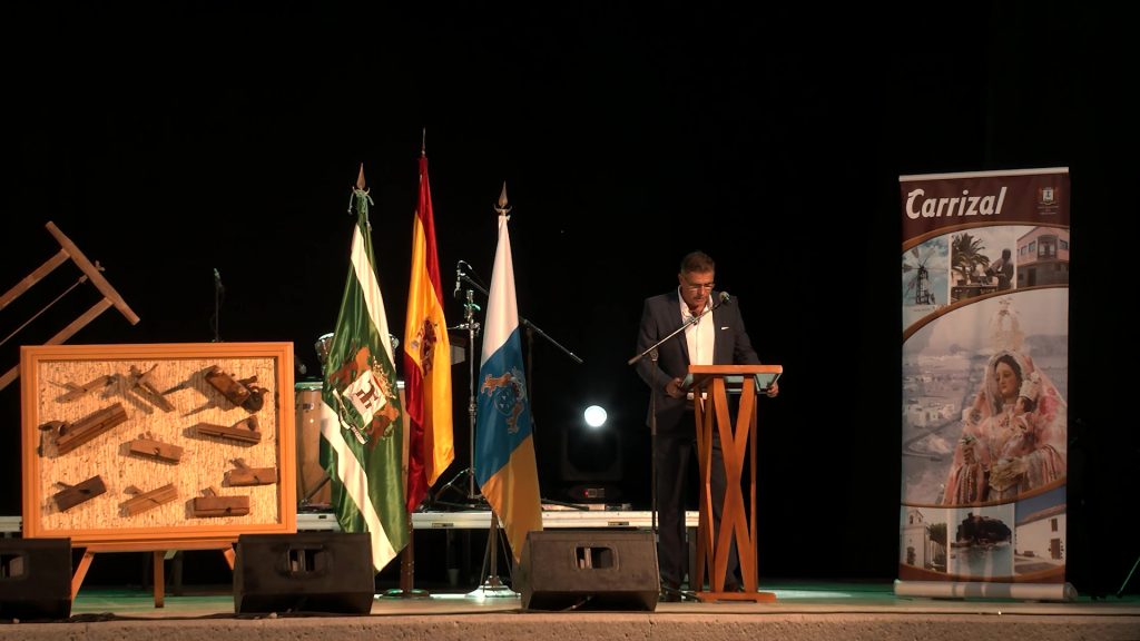 Tras una cálida ovación por parte del numeroso público congregado, la alcaldesa; el primer teniente de alcalde y concejal de Festejos, Rayco Padilla y la presidenta de la Asociación Patronato Bicentenario de la Virgen – Fiestas Patronales de Carrizal, Pimpina Herrera, hicieron entrega de un presente al pregonero en reconocimiento a su magnífica intervención.