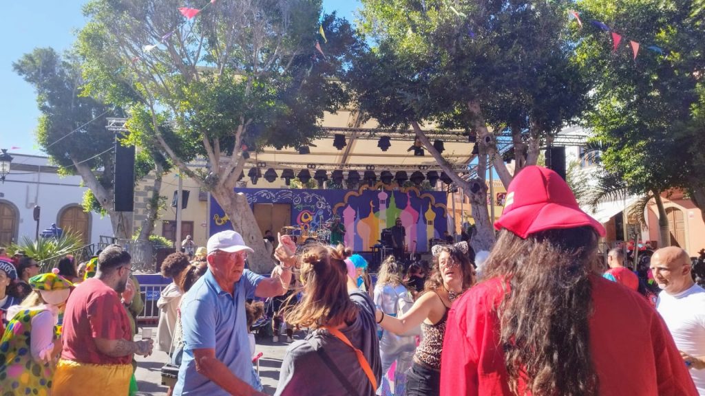 El casco de Agüimes ha festejado este sábado su Carnaval de Día, uno de los actos más esperados de la programación de las carnestolendas de este año. La celebración tuvo como epicentro la plaza del Rosario, espacio donde cientos de carnavaleros vibraron al son de la música de reconocidas agrupaciones como Los 600, La Buena Vibra, Ritmo Bakano o Señor Natilla y artistas como King África, quien no abandonó el escenario sin interpretar su éxito mundial ‘Bomba’. Como cabeza de cartel actuó la banda de bachata Grupo Extra, afamada por temas como ‘Me emborracharé’ o ‘A través del vaso’.