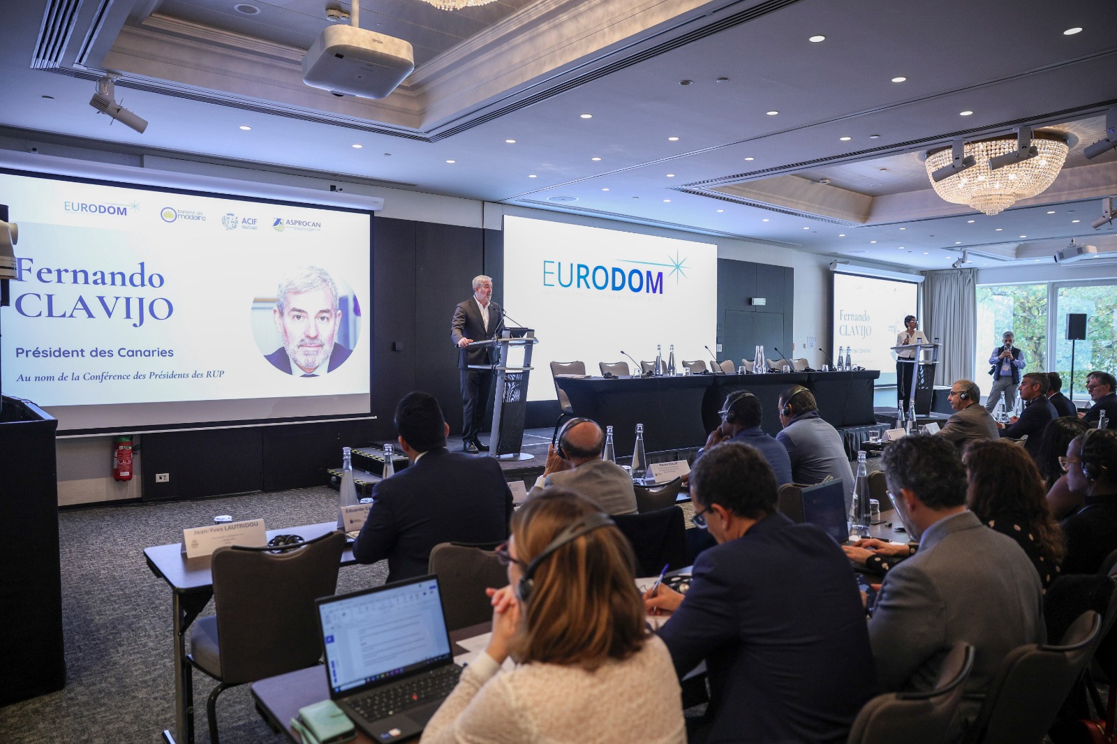 El titular del Gobierno autonómico intervino en el acto organizado por Eurodom en dos ocasiones. En primer lugar, abrió la jornada de movilización hablando en nombre de las nueve regiones ultraperiféricas amparadas por el artículo 349 del Tratado de la UE: Canarias, Azores, Madeira, Guadalupe, Martinica, Guayana Francesa, Reunión y Mayotte.