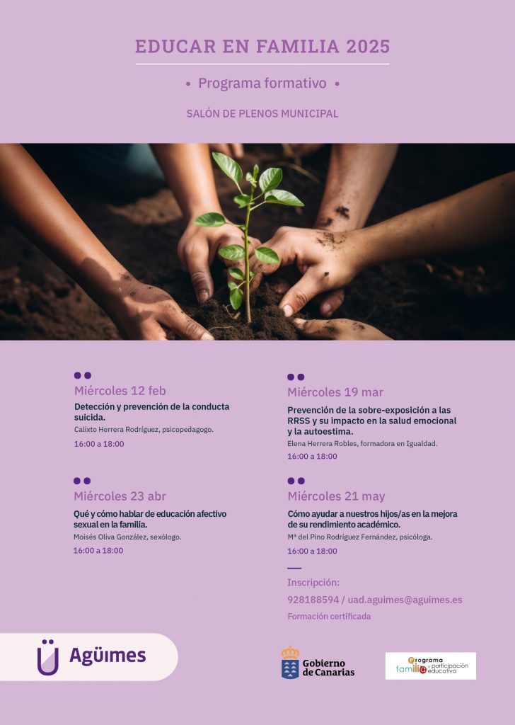 El Salón de Plenos del Ayuntamiento de Agüimes acoge una nueva edición del programa formativo ‘Educar en familia’, una iniciativa promovida por la Consejería de Educación del Gobierno de Canarias, en colaboración con el Ayuntamiento, que ofrece a padres y madres herramientas, estrategias y asesoramiento para establecer una mejor relación educativa con sus hijos e hijas. El ciclo, que se desarrollará entre febrero y mayo, contará con cuatro talleres impartidos por diferentes expertos que abordarán asuntos relacionados con la prevención del suicidio, la educación afectivo-sexual, los peligros de las redes sociales o el rendimiento académico.