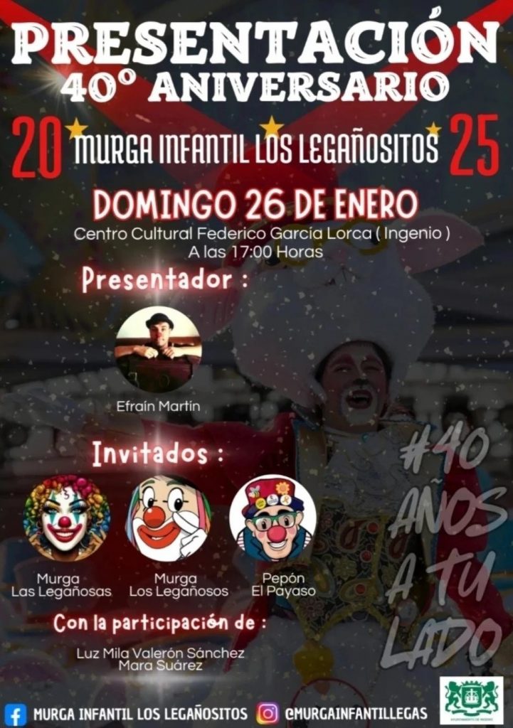El Carnaval está a punto de inundar la Villa de Ingenio, y serán los y las más jóvenes quienes, con su entusiasmo y creatividad, inauguren la temporada murguera. La Murga Infantil Los Legañositos de Carrizal será la primera en llenar de purpurina el escenario del teatro del Centro Cultural Federico García Lorca para celebrar su acto de presentación oficial y Gala por su 40º aniversario el domingo, 26 de enero, a las 17:00 horas.