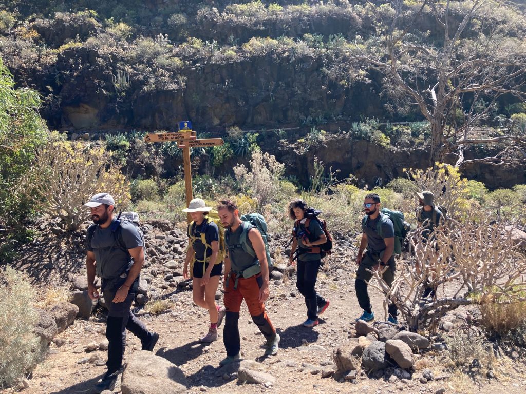 Justamente al día siguiente, el lunes 13, las y los senderistas proseguían su camino, realizando la 12ª etapa (de 25) de la ruta desde El Burrero, subiendo por el Barranco de Guayadeque hasta el Pico de las Nieves, explicando precisamente durante el recorrido Aníbal y Hans, responsables de la parte artística de la expedición, cómo este proyecto combina el deporte con eventos culturales y encuentros comunitarios, promoviendo la participación activa de la población local. “Nuestra función es llevar el folklore y las tradiciones ancestrales, como la música, la danza, el silbo, por todo el archipiélago, dar a conocer todo lo que hemos aprendido en tantos años. Aunque nos hemos dado cuenta de que, en lugar de enseñar estamos nosotros aprendiendo en cada lugar al que vamos,” manifestaba Llarena. Por su parte Hans Thomsten expresaba que a él “el folklore me nace desde hace años y tengo interés en divulgar nuestra idiosincrasia, y eso es lo que intentamos hacer llegar al pueblo, esperando que responda de forma recíproca”.