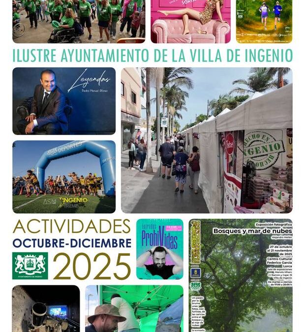 Ya se encuentra disponible en la página web municipal www.ingenio.es la nueva programación trimestral de actividades del Ayuntamiento de Ingenio, correspondiente a los meses de octubre, noviembre y diciembre. Este calendario no incluye los actos navideños, que contarán con un folleto específico.