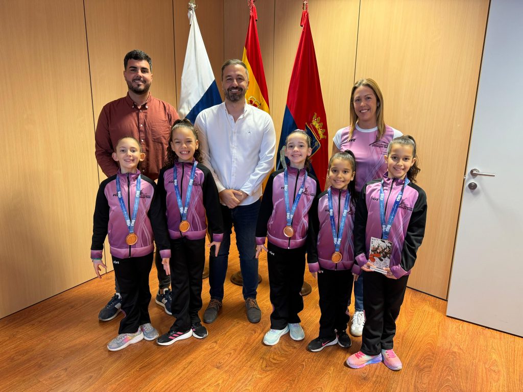 El alcalde de Telde, Juan Antonio Peña, y el concejal de Deportes, Cristhian Santana, recibieron en la mañana de este martes a las alumnas del Club de Gimnasia Rítmica Attenya Telde, quienes se alzaron con la medalla de bronce a finales del pasado mes de noviembre en el campeonato de España prebenjamín, celebrado en Zaragoza.