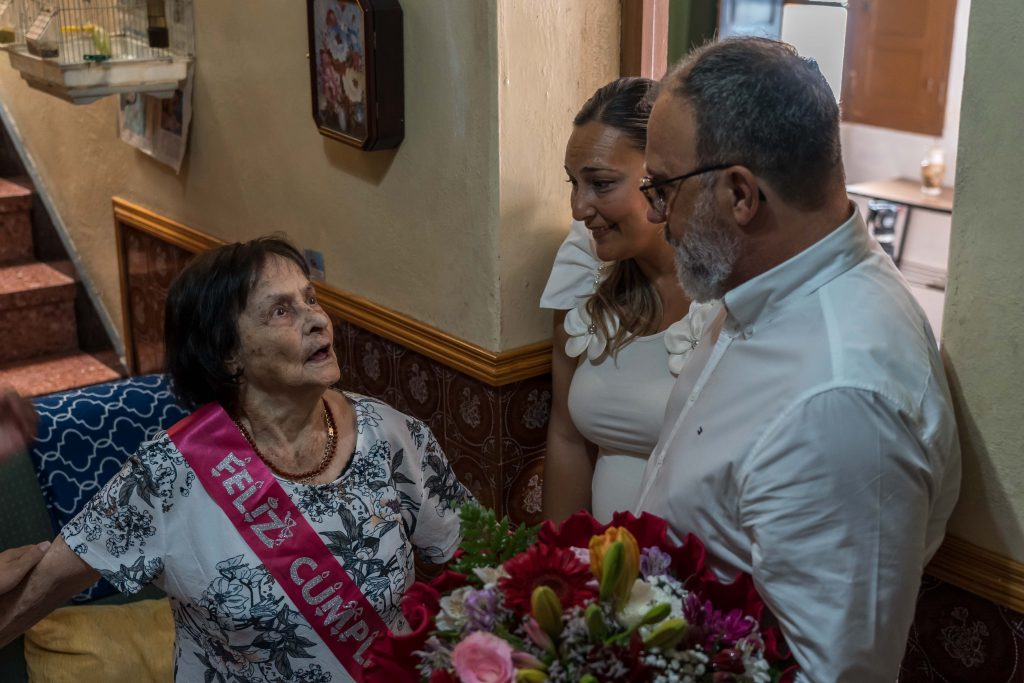 Con el pelo teñido y una banda rosada sobre su vestido en la que pone ‘Feliz cumpleaños’, Isabel se sienta en el salón junto a una mesa con dulces y refrescos. La centenaria santaluceña invita al alcalde y a la concejala a un refresco, y conversa con ellos sobre los presentadores de televisión. Chicote es ese hombre que habla de recetas gritando, y por las tardes Isabel se sienta frente a la tele a ver a Sonsoles. A veces falla un poco la memoria, pero Isabel es capaz de caminar por los pasillos de su casa, sin andador, apoyándose en unas barandillas que le han puesto sus hijos.