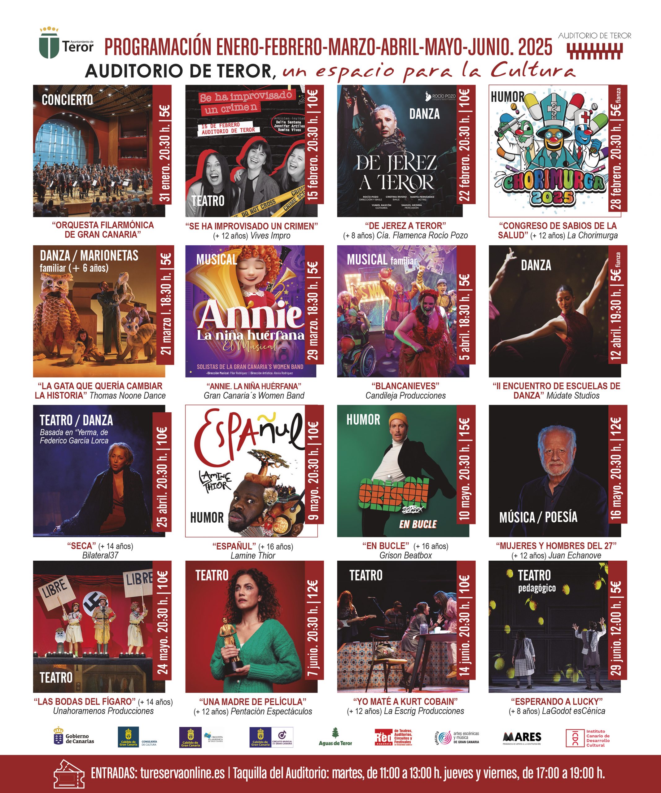 “El Auditorio de Teror presenta un magnífico cartel para todos los públicos, poniendo de manifiesto su compromiso con acercar la cultura a la ciudadanía y hacerla asequible, con unos precios muy económicos”, comentó el primer edil Sergio Nuez, invitando a asistir a los espectáculos ofertados.