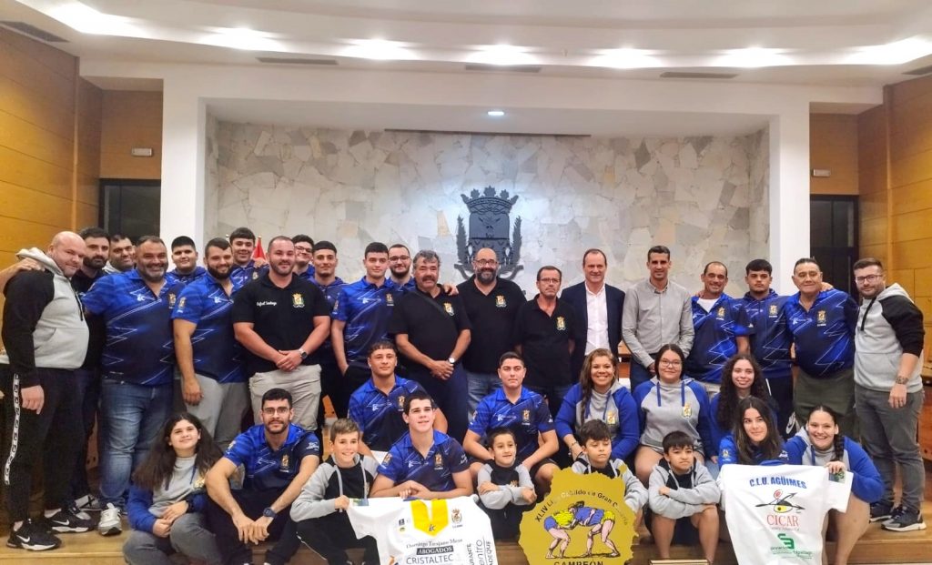 Una amplia representación del Club de Lucha Unión Agüimes se dio cita este lunes en el Salón de Plenos del Ayuntamiento de Agüimes para recoger la placa que la institución municipal, de manos de su alcalde, Óscar Hernández, entregó al equipo en reconocimiento a sus últimos éxitos deportivos. El último de estos éxitos, el campeonato de la Superliga Cabildo de Gran Canaria de Segunda Categoría, conquistado el pasado 8 de marzo en una emocionante final disputada en el terrero municipal de Vecindario, en la que el equipo agüimense consiguió derrotar al Club de Lucha Castillo, de San Bartolomé de Tirajana, por un ajustado 12-10.