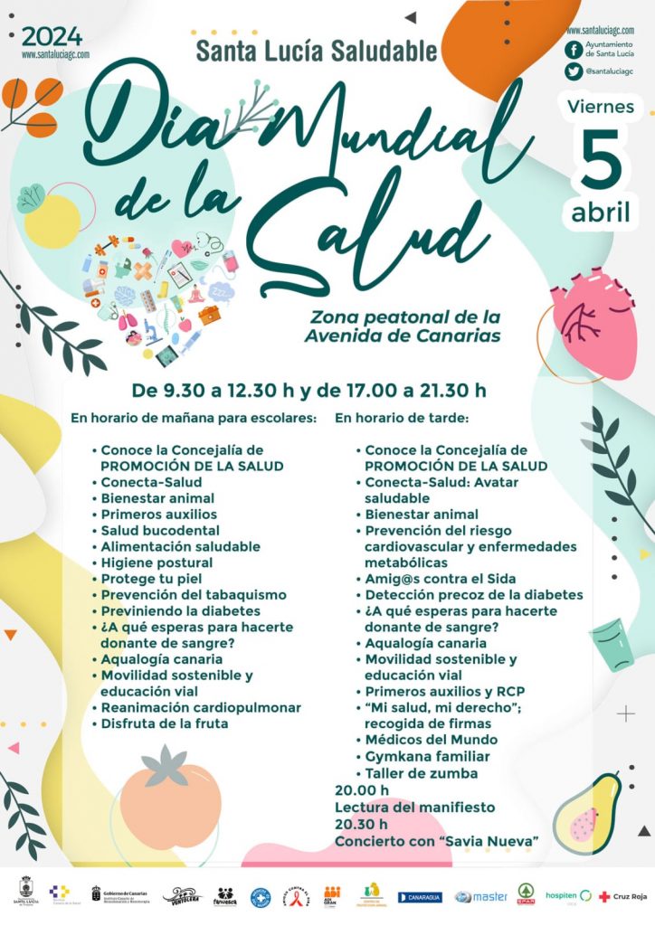 Con motivo del Día Mundial de la Salud este  viernes  5 de abril el Ayuntamiento  de  Santa Lucía de Tirajana ha organizado un amplio programa de actividades preventivas con la finalidad de sensibilizar y promover un estilo de vida activo y hábitos de vida saludables para toda la población. Los actos de la mañana están dirigidos a escolares del municipio serán de 9.30 a 12.30 en la zona peatonal de la Avenida de Canarias, y por la tarde, de 17 a 21.30, las actividades serán en el mismo lugar y estarán dirigidas a los vecinos y vecinas y los colectivos sociales.