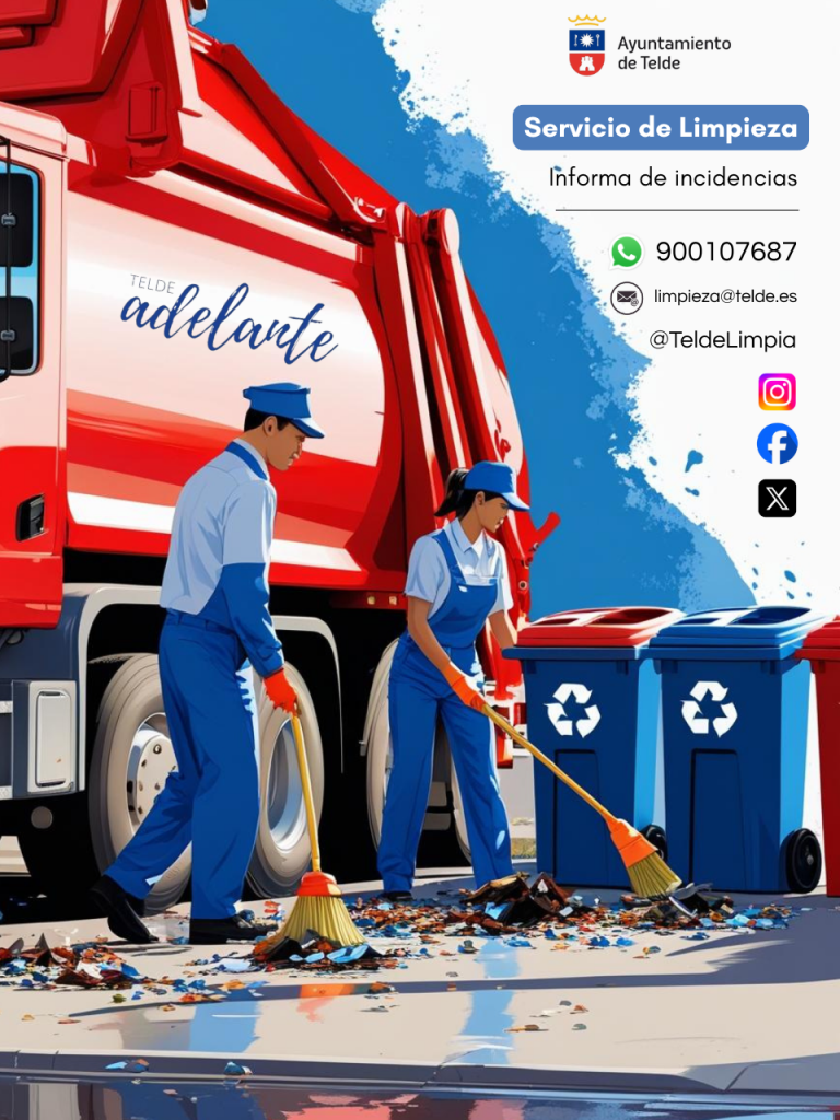 La Concejalía de Limpieza Viaria y Recogida de Residuos del Ayuntamiento de Telde, dirigida por María Calderín, solicita colaboración ciudadana para informar de incidencias, en materia de limpieza, que puedan surgir en el municipio. Este es un servicio que funciona a través de WhatsApp y perfiles oficiales en redes sociales, cuyo objetivo es mantener una comunicación directa, ágil y efectiva con la ciudadanía.