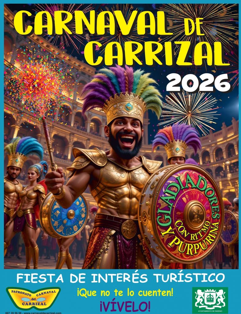 Organizado por el Patronato del Carnaval de Carrizal y el Ayuntamiento de Ingenio, el Carnaval llega bajo la alegoría de ‘Los Gladiadores’, trayendo este lunes, 6 de abril, el Carnaval Inclusivo, que se celebrará de 17:30 a 20:00 horas en la Plaza de La Coronación de La Jurada, contando con la participación de diversos centros ocupacionales de la isla. El martes, 7 de abril, será el turno de la Gala Drag, a partir de las 21:00 horas en el escenario de La Jurada, que contará con la obertura de la comparsa Aragüimé. Por otro lado, el miércoles 8 se celebrará el Concurso de Murgas a partir de las 20:30 horas, contando con la participación de Los Legañosos y Los Legañositos como murgas invitadas para abrir el certamen, mientras que el jueves 9 habrá actuaciones musicales a cargo de dos academias de baile y verbena con Las Ladys del Swing a partir de las 20:00 horas.