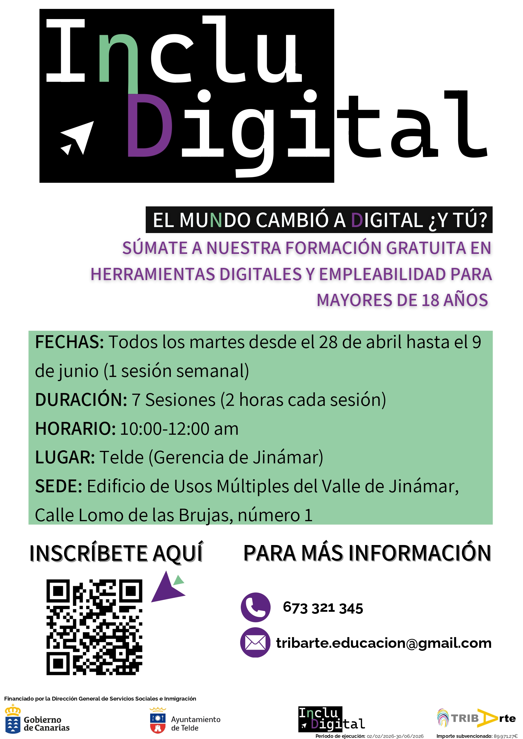 El programa IncluDigital cuenta con financiación de la Dirección General de Servicios Sociales e Inmigración del Gobierno de Canarias, y las personas interesadas pueden inscribirse o solicitar más información a través del teléfono 673 321 345 o del correo electrónico tribarte.educacion@gmail.com.