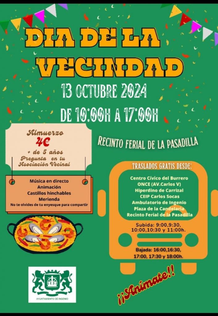 El Día de la Vecindad de la Villa de Ingenio, jornada que tiene como fin que las personas residentes del municipio, así como familiares y amistades disfruten de buenos momentos de ocio y convivencia, se celebrará el domingo, 13 de octubre. El evento tendrá lugar en el recinto ferial de La Pasadilla, y promete ser un día repleto de actividades que invitan a compartir momentos de ocio y disfrute comunitario.