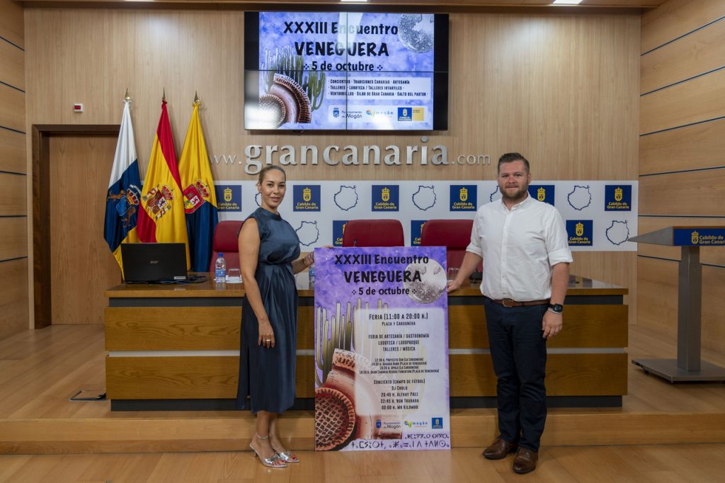La presentación del XXXIII Encuentro Veneguera ha tenido lugar este martes 24 de septiembre en el Edificio Insular I de la capital grancanaria de manos de la consejera del Cabildo de Gran Canaria, Guacimara Medina, y el concejal de Cultura del Ayuntamiento de Mogán, Mencey Santana, quien manifestó que la programación de esta edición supone un “un regreso al origen de este emblemático evento”, caracterizado desde su nacimiento por promover el respeto a los valores y tradiciones canarias y al medio ambiente, pero también por ser una plataforma para dar a conocer la música y los artistas del Archipiélago, que tienen la oportunidad de compartir espacio con otros de la esfera nacional e internacional.