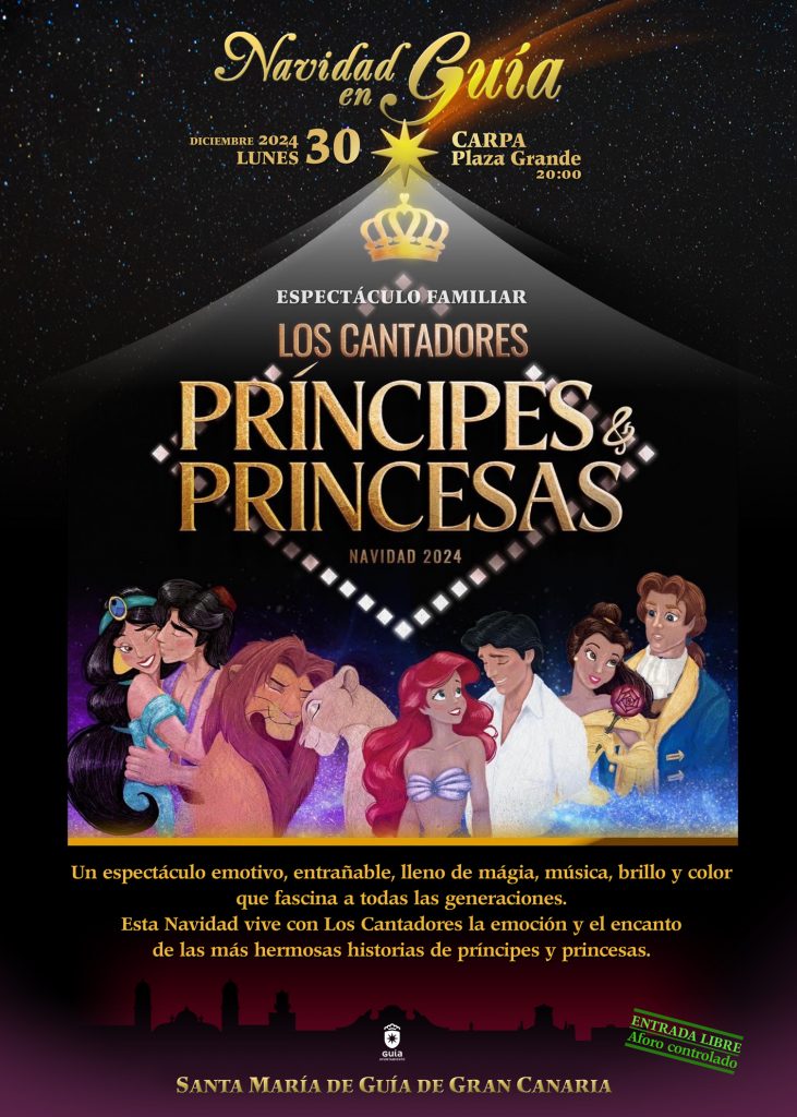 La Plaza Grande acoge este lunes 30 de diciembre, a las 20:00 horas, en exclusiva en Gran Canaria, el   espectáculo “Los Cantadores: Príncipes y Princesas de Disney” un evento mágico que reúne a talentosos intérpretes para revivir las canciones más icónicas del universo Disney.