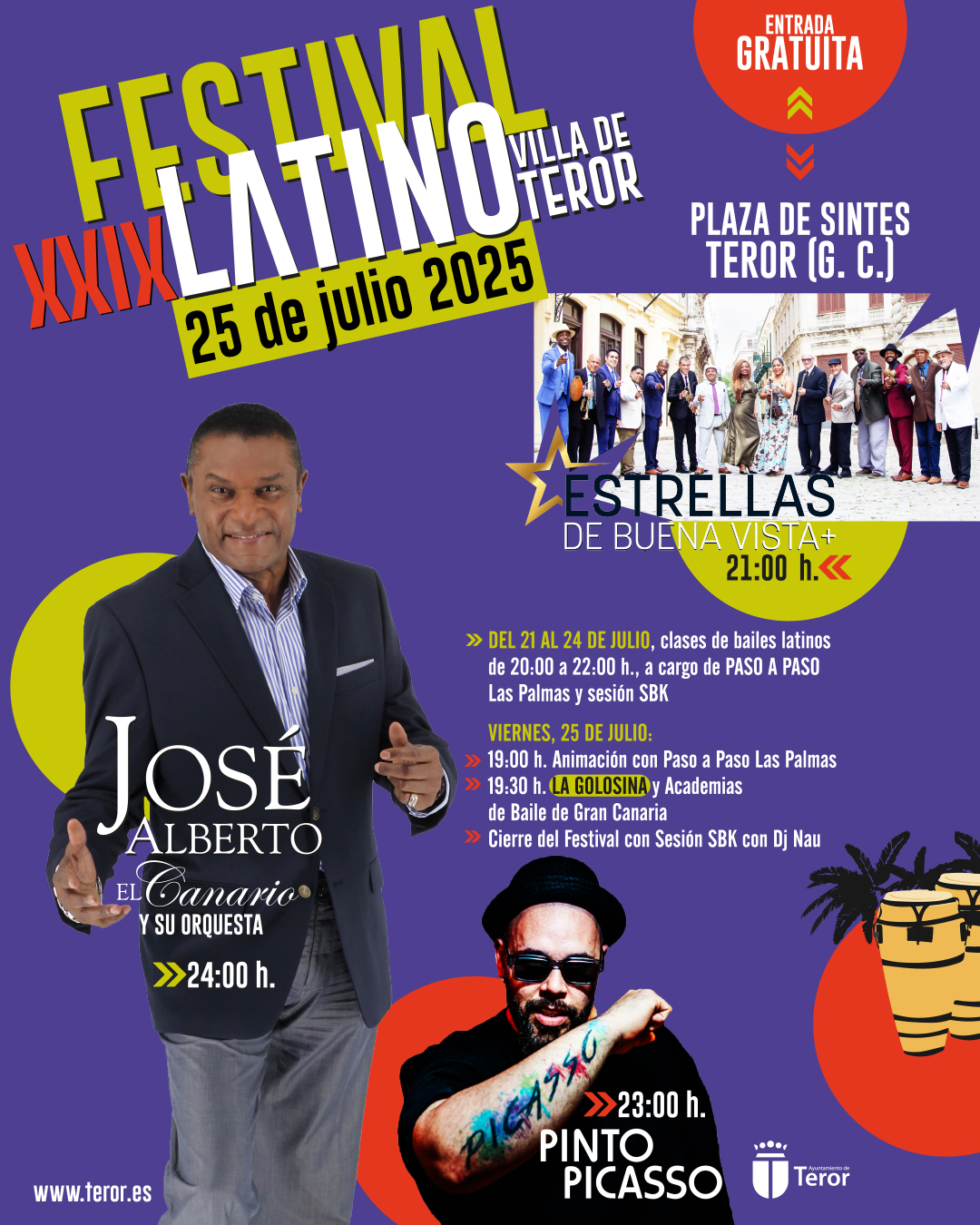 El gran día del 29º Festival Latino Villa de Teror llega este viernes 25 de julio con los conciertos del dominicano José Alberto ‘El canario’, todo un referente de la música latina, los sonidos tropicales el puertoriqueño Pinto Picasso y, desde Cuba estará ‘Estrellas de Buena Vista y Más’. La Plaza de Sintes en Teror acogerá este veterano Festival, que comenzará a las 19:00 horas con animación de la Academia Paso a Paso Las Palmas y las Academias de Baile de Gran Canaria, además del concierto que ofrecerá La Golosina a partir de las 19.30 horas. La noche cerrará con sesión SBK de Dj Nau, quien pondrá todo el ritmo con grandes éxitos de la salsa, la bachata y la kizomba.