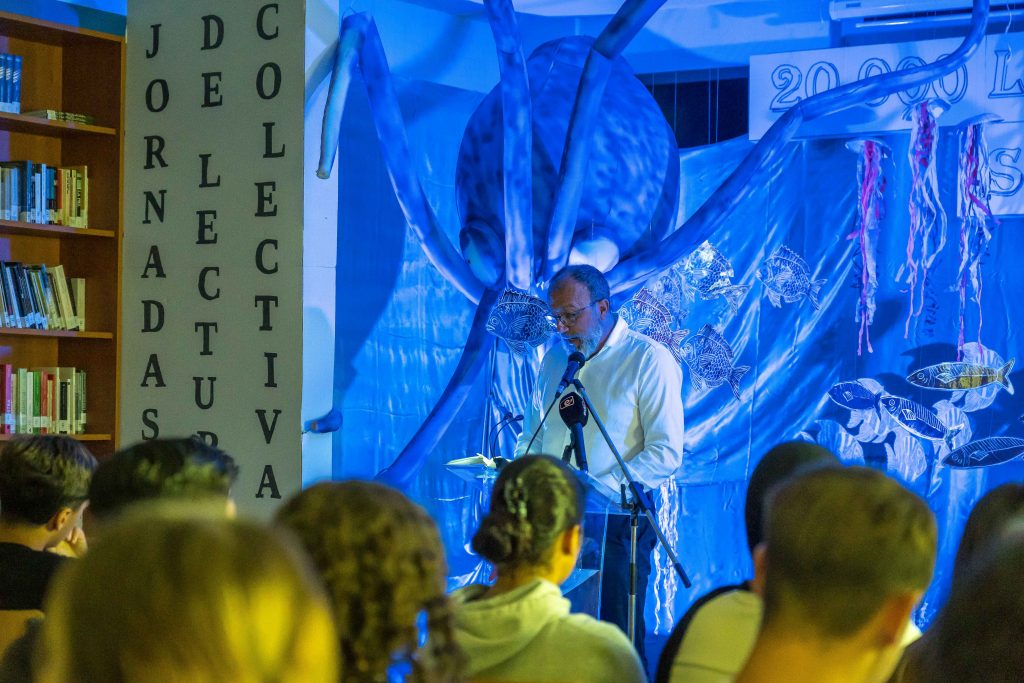 Tanto el escaparate de la librería como la biblioteca se han decorado eligiendo como tema la obra ‘Veinte mil leguas de viaje submarino ‘ de Julio Verne. Las lecturas se realizan con un fondo azul de mar, los restos de un submarino, peces y plantas de fondos marinos. El profesor de Biología Juan Agustín coordinó la decoración en la que “participaron muchos alumnas y alumnas, profesores, incluso personal no docente, todos los que pasaban por la biblioteca los ponía a hacer algo”.