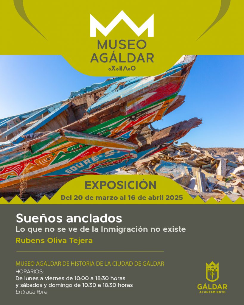 El Museo Agáldar de Historia de la Ciudad acoge, del 20 de marzo al 16 de abril, la exposición ‘Sueños Anclados. Lo que no se ve de la inmigración no existe’, de Rubens Oliva Tejera. Se trata de una exposición fotográfica de pateras y cayucos así como objetos abandonados en dichas embarcaciones entre abril de 2023 y abril de 2024 en el ‘cementerio de pateras’ de Agüimes.