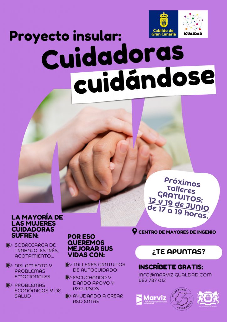 Los días 12 y 19 de junio llegará a la Villa de Ingenio el proyecto insular ‘Cuidadoras cuidándose’ que ha lanzado la Consejería de Igualdad del Cabildo de Gran Canaria y que consiste en impartir 42 talleres gratuitos de autocuidados en los 21 municipios de la isla entre mayo y octubre de este año. El Centro de Mayores de la Villa de Ingenio será el espacio en el que se impartan los dos talleres de dos horas de duración, de 17 a 19 horas.