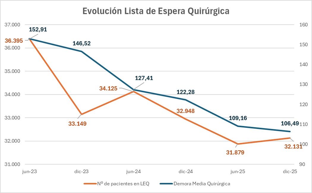 Asimismo, Monzón explicó que a 31 de diciembre de 2025 se habían realizado un total de 149.635 intervenciones quirúrgicas, alcanzando un récord histórico con medios propios, y que la lista de espera quirúrgica interanual registra un total de 32.131 personas, lo que implica un descenso interanual del 2,5 por ciento.