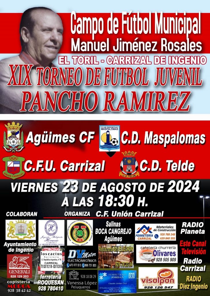El XIX Torneo Pancho Ramírez comenzará a las 19.00h de este viernes, 23 de agosto. En él participarán cuatro equipos de categoría juvenil: CD Telde, CD Maspalomas, CD Agüimes y el anfitrión CFU Carrizal. El acceso al campo Manuel Jiménez Rosales de El Toril será de carácter gratuito. Desde el Club organizador, el presidente Mario Ramírez invita a la ciudadanía a no perderse este Torneo que, no sólo “rememora la trayectoria de Pancho Ramírez, sino que muestra el presente y el futuro de este deporte a través de nuestra cantera”.