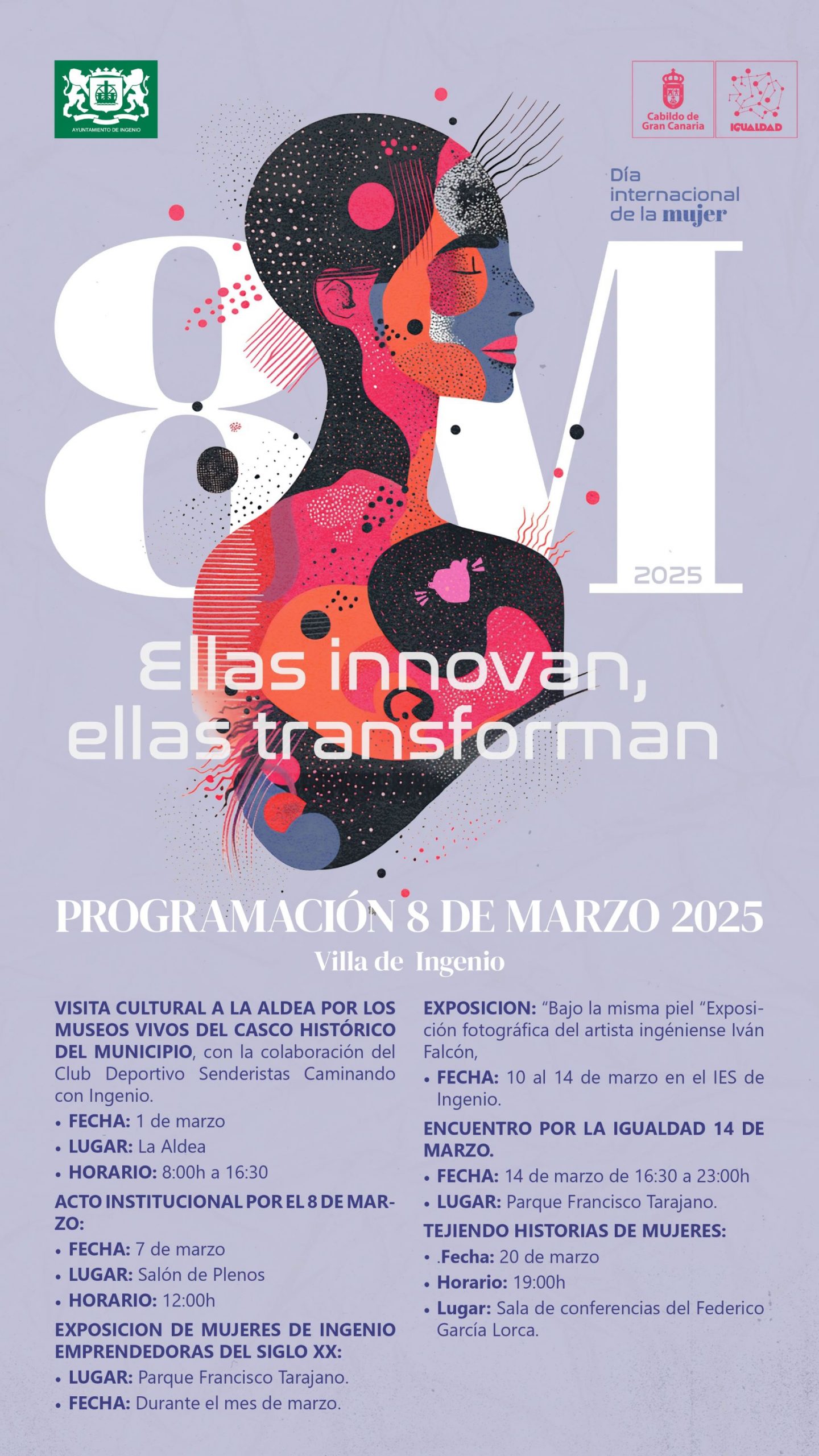 Bajo el lema “Ellas innovan, ellas transforman”, el Ayuntamiento de Ingenio, a través de la Concejalía de Igualdad y Diversidad, ha preparado su programación para conmemorar el 8 de marzo, Día Internacional de las Mujeres. La agenda de actividades, que se extenderá durante todo el mes, incluirá exposiciones, talleres, rutas culturales, un encuentro por la igualdad y el acto institucional con la entrega del Reconocimiento 8M.