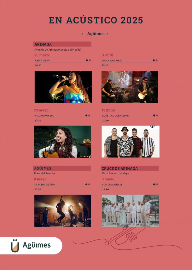 El 11 de abril, la música volverá al mismo espacio del núcleo costero de la mano del grupo Vodka and Rock, que hará vibrar al público con canciones de autoría propia y adaptaciones de los grandes clásicos del punk underground. Por otro lado, los apasionados del género latino tendrán una cita especial el 3 de mayo en la plaza Primero de Mayo del Cruce de Arinaga, donde actuará el grupo Son de Almizcle. Más tarde, el 9 de mayo, la plaza del Rosario de Agüimes acogerá un concierto del grupo La Boina de Fito, en el que sonarán los temas más conocidos de la consagrada banda bilbaína Fito y Los Fitipaldis.