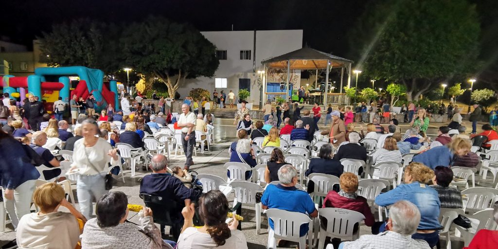 Los actos comenzaron sobre las 18:30 en la plaza de Las Ramblas de Agüimes, con una representación teatral en el Centro de Mayores, escenificando con humor varias historias sobre la vida cotidiana, representadas por miembros del Taller de Adultos de Teatro de Arinaga. Mientras, afuera, niños y niñas disfrutaron pegando brincos en las diversas colchonetas dispuestas en la plaza para su deleite.