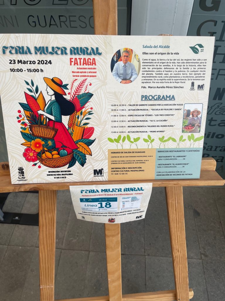 La I Feria Mujer Rural, en la que se rendirá homenaje a cinco mujeres emprendedoras de la localidad de Fataga, ofrecerá a los visitantes una veintena de stands con productos agrícolas y artesanales del municipio, como café, quesos, vino, guarapo, bombones, licores, mermeladas, pan, fruta, repostería y miel, y también  joyería, bisutería, bolsos y alfombras traperas, complementos y cuadros de material reciclado, ropa, juguetes de madera, pinturas en telas; bisutería, sombreros y bolsos de palma y macramé; diferentes artesanías de resina y libros de temática canaria y cuentos infantiles entre otros.