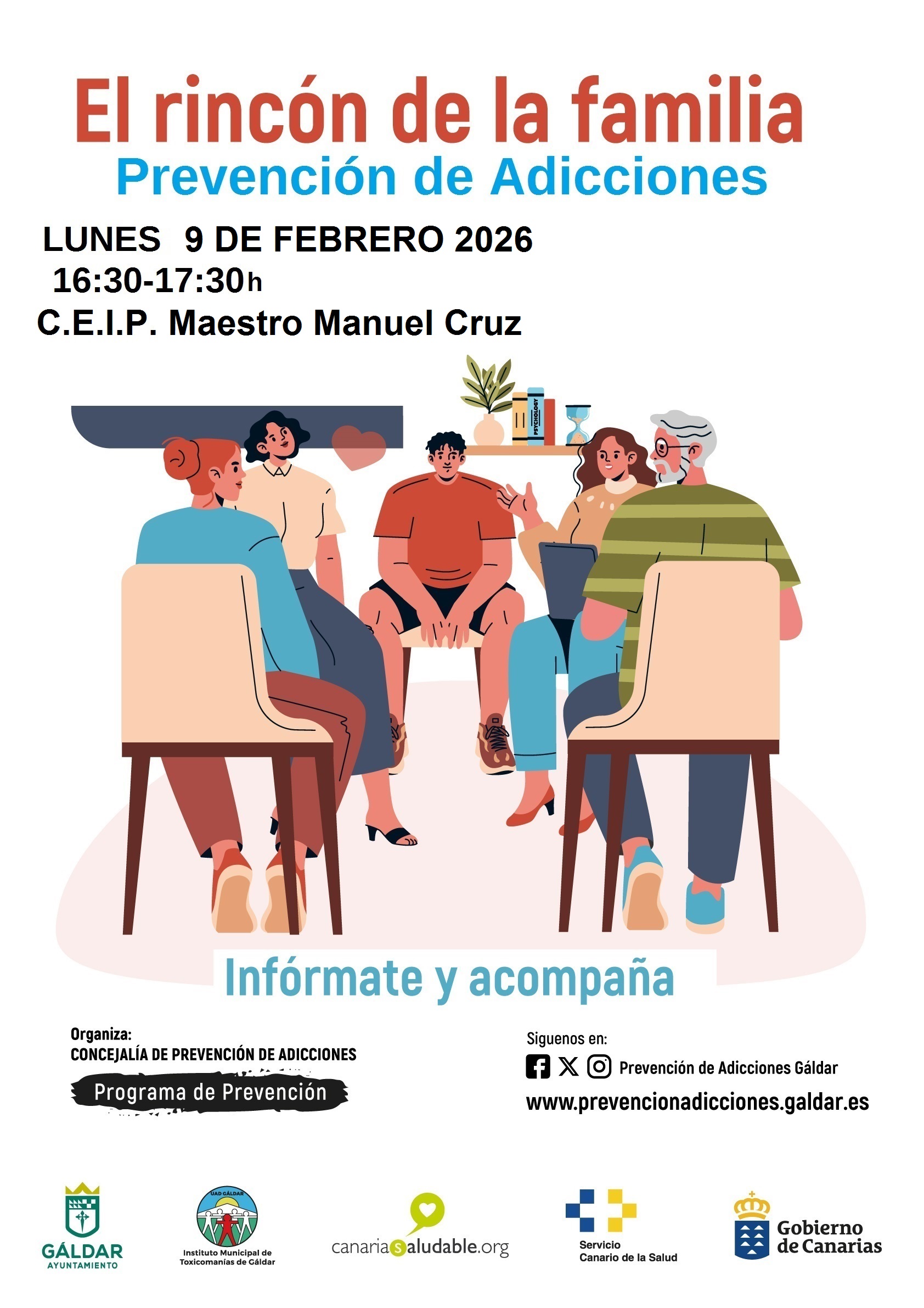 El Ayuntamiento de Gáldar, a través de la concejalía de Prevención de Adicciones dirigida por Nuria Esther Vega Valencia, ha creado ‘El rincón de la familia’, un espacio concebido para ofrecer información y orientación a las familias en materia de prevención de adicciones. El evento se celebrará el lunes 9 de febrero de 2026, de 16:30 a 17:30 horas, en el centro educativo Maestro Manuel Cruz.