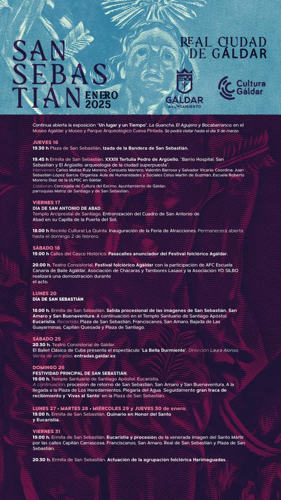 La Concejalía de Cultura y Fiestas del Ayuntamiento de Gáldar, que dirige Julio Mateo Castillo, ha hecho público el programa de actos de las Fiestas Principales en honor a San Sebastián 2025, celebradas desde hace más de cinco siglos en el municipio, y que se desarrollará durante dos semanas en el barrio y en el casco de la ciudad. Actos populares, religiosos y culturales protagonizan el programa, que tiene en sus citas más tradicionales la Izada de la Bandera, la Tertulia Pedro de Argüello, la procesión y la Plegaria del Agua.
