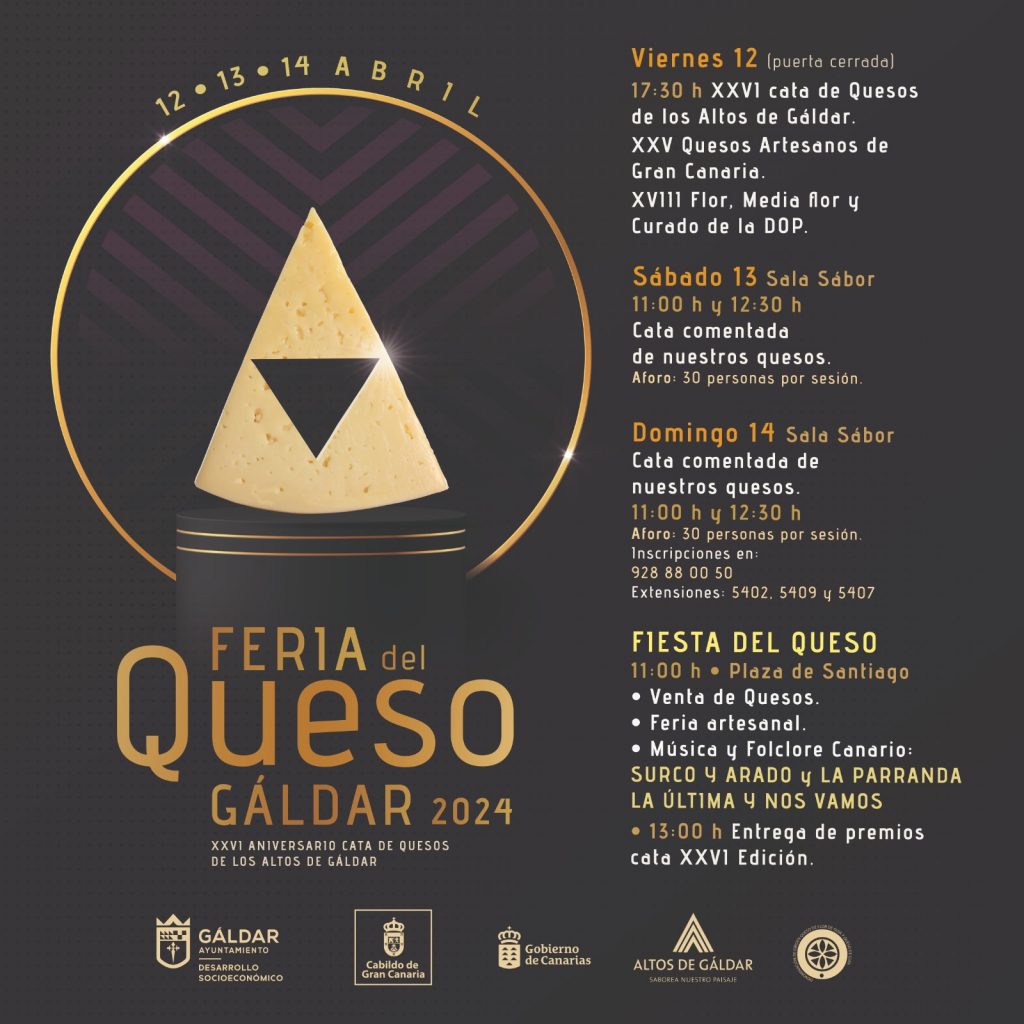 La Concejalía de Desarrollo Socioeconómico del Ayuntamiento de Gáldar, que dirige Tine Martín, ha sacado a la luz la programación de esta cita que tiene su acto central el día 14 con la Fiesta del Queso, en la que habrá puestos de venta de este producto, feria artesanal y la entrega de los premios a la XXVI Cata de Quesos de los Altos de Gáldar, la XXV de Quesos Artesanos de Gran Canaria y la XVIII Cata de Queso Flor, Media Flor y Curado de la DOP. Además se contará con las actuaciones musicales de las agrupaciones folclóricas ‘Surco y Arado’ y la parranda ‘La última y nos vamos’.