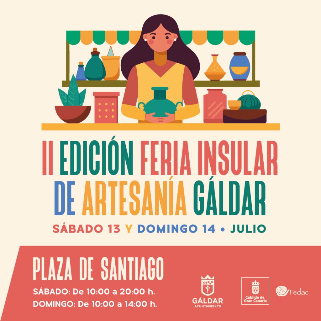 Gáldar se convierte este fin de semana en el epicentro de la tradición de Gran Canaria con la celebración el sábado 13 de julio, de 10.00 a 20.00 horas, y el domingo 14, de 10.00 a 14.00 horas, de la II Feria Insular de Artesanía en la Plaza de Santiago. La Concejalía de Desarrollo Socioeconómico, que dirige Tine Martín Ojeda, y la Fedac del Cabildo de Gran Canaria organizan este evento, que pone en valor la calidad de los productos artesanales de la Isla y contará con actuaciones musicales.
