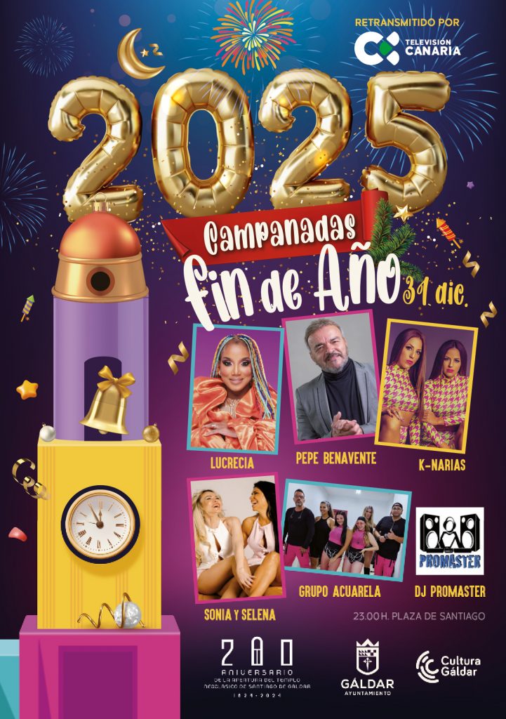 La programación de Gáldar Ciudad Navidad afronta este martes una Nochevieja histórica. Gáldar será la ciudad protagonista de las retransmisión de las campanadas de Radio Televisión Canaria por primera vez en los 25 años de vida del ente autonómico. Y lo hará en una noche con mucha música y grandes artistas desde la Plaza de Santiago en un evento organizado por la Concejalía de Cultura y Fiestas, que dirige Julio Mateo Castillo.