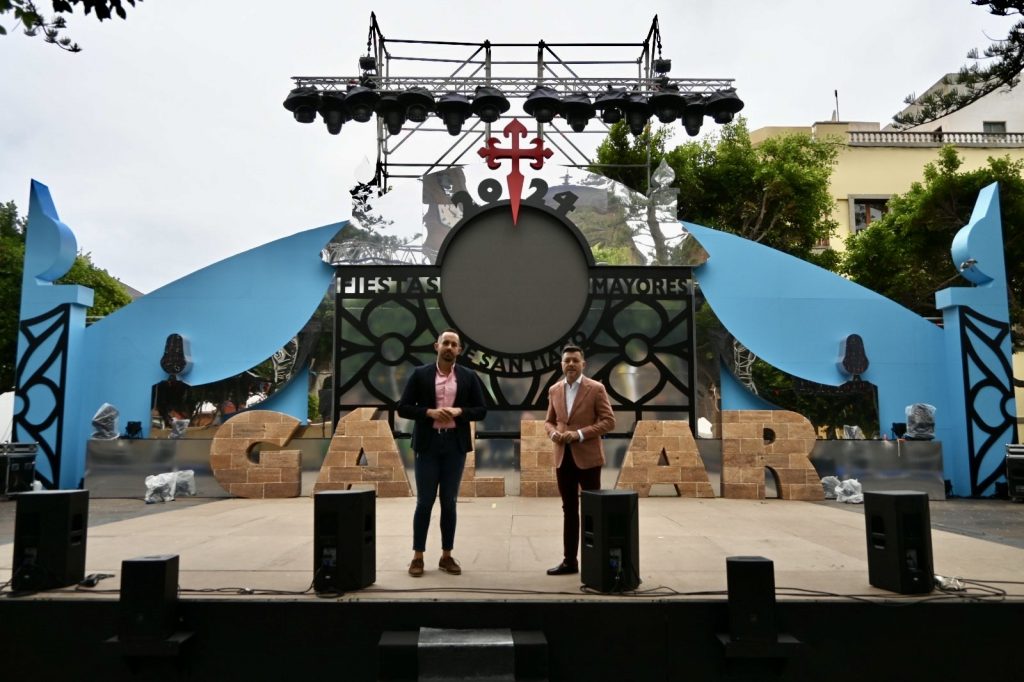 El escenario de las 542º Fiestas Mayores de Santiago ya es una realidad. En esta edición el escenario está inspirado en el 200 aniversario de la apertura al culto del Templo Santuario de Santiago, una efeméride que ha servido de temática también para la programación de las Fiestas. Teodoro Sosa Monzón, alcalde de Gáldar, acudió junto a Julio Mateo Castillo, teniente de alcalde y concejal de Cultura y Fiestas, a comprobar en la mañana de este jueves el escenario, que vivirá en la noche de este viernes su primer evento con la Gala Voces de Gáldar 2024 a partir de las 20.30 horas. Además, el domingo 7 de julio albergará también la V Gala del Deporte y a partir del martes 9 de julio continuará con la semana del folclore.