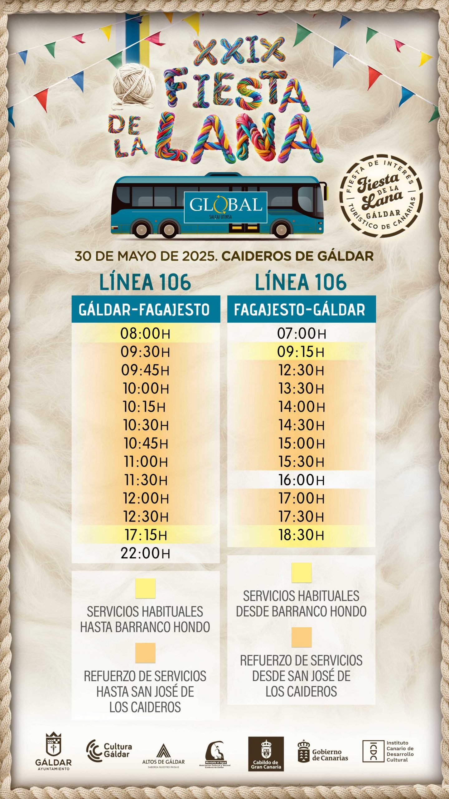 Para ello, el Ayuntamiento de Gáldar anima a la ciudadanía a acudir en transporte público. Guaguas Global ha reforzado la Línea 106, que une el casco de Gáldar y Fagagesto, que saldrá de la Estación a las 8.00, 9.30, 9.45, 10.00, 10.15, 10.30, 10.45, 11.00, 11.30, 12.00 y 12.30 horas. Mientras, para la vuelta los horarios son 12.30, 13.30, 14.00, 14.30, 15.00, 15.30, 16.00, 17.00, 17.30 y 18.30 horas.
