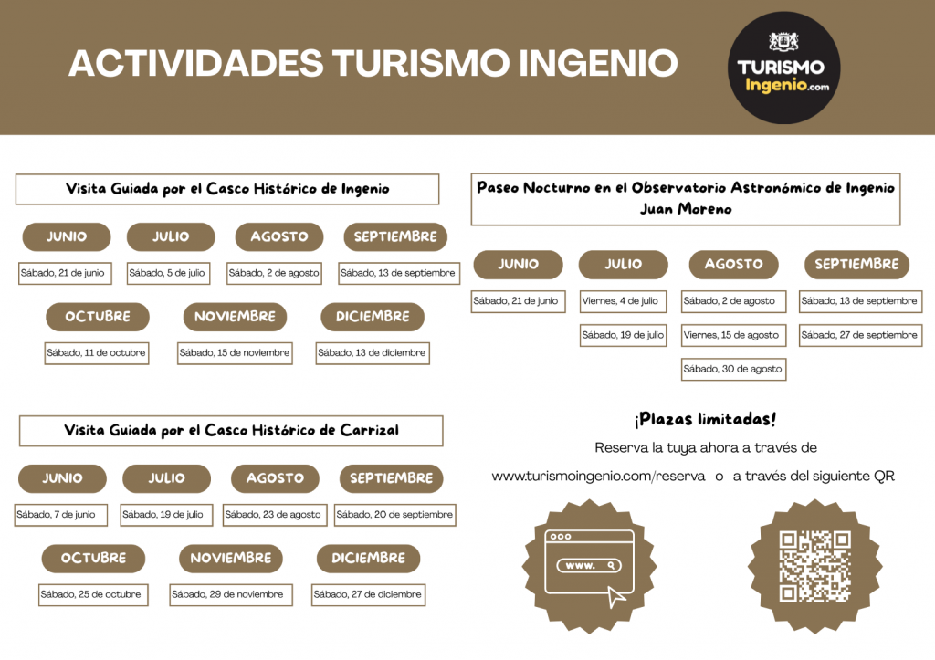 Las reservas para las próximas fechas pueden realizarse a través del portal www.turismoingenio.com. Para más información, está disponible la Oficina de Turismo de la Villa de Ingenio, en el teléfono 928 78 37 99 o mediante el correo electrónico turismo@ingenio.es.