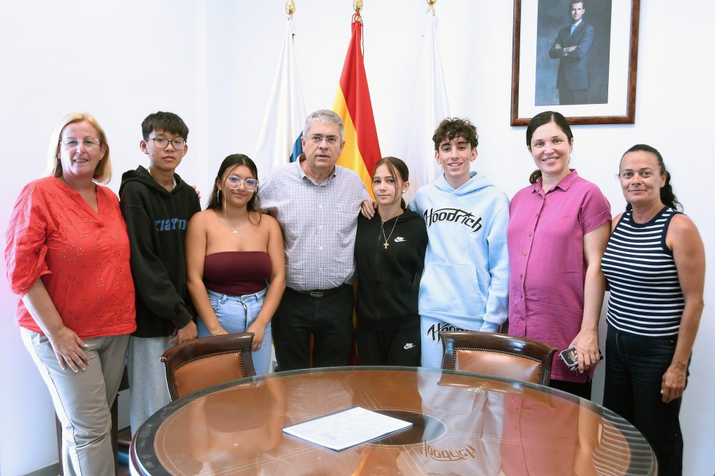 Los estudiantes Nagore Santana, Itaisha Martel, Jinhao Jiang y Yeroel Abrante, supervisados por la profesora Nicolette Pegels, se reúnen con el alcalde Marco Aurelio Pérez para explicar su ‘Pollinator Pack’, el proyecto con el que representaron a Canarias en el concurso de talentos de la Fundación La Caixa