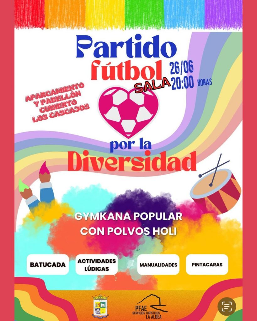 La Aldea de San Nicolás celebra este miércoles, 26 de junio, a las 20:00 horas, un partido de fútbol sala por la diversidad en el pabellón Los Cascajos. Una jornada conmemorativa que tendrá lugar dentro de los actos del Día del Orgullo LGTBAIQ+ que se celebra este viernes, 28 de junio.
