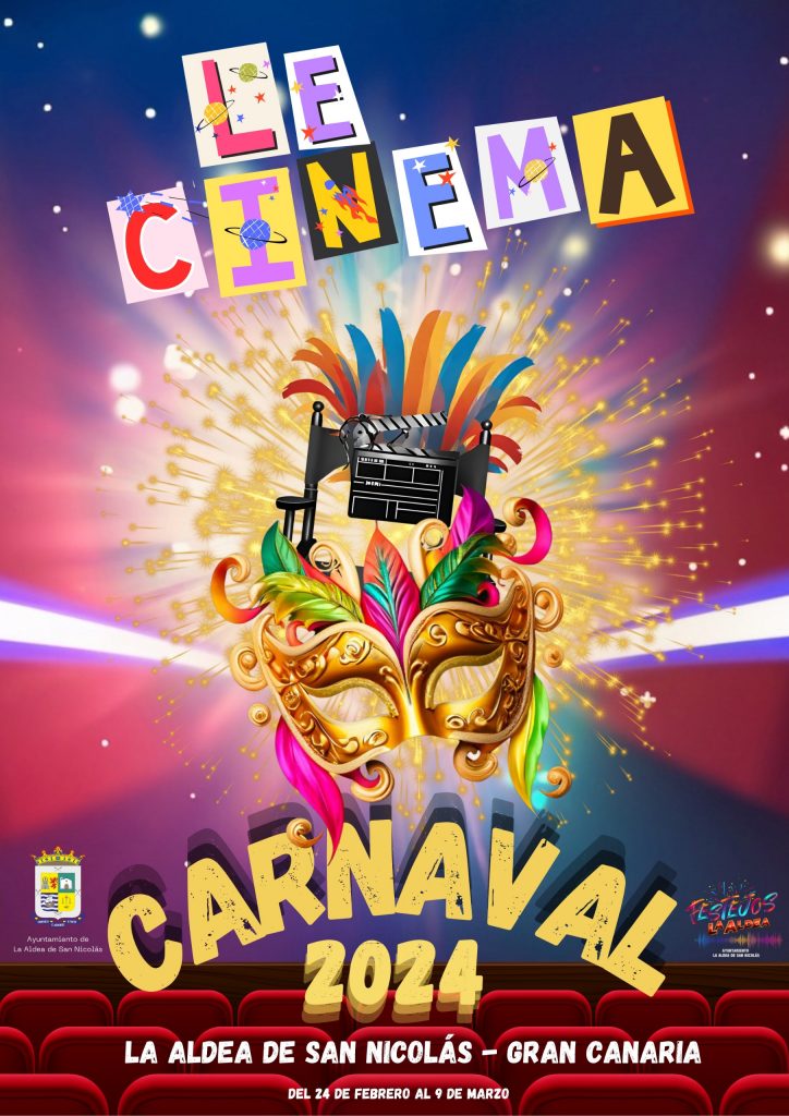 La Concejalía de Festejos del Ayuntamiento de La Aldea de San Nicolás, que dirige Néstor Oliver Ramírez, ha presentado el cartel del Carnaval 2024, que se celebrará del 24 de febrero al 9 de marzo. La alegoría elegida por votación popular este año es ‘Le Cinéma’, por lo que el municipio se convertirá en un  gran plató cinematográfico en el que no faltarán personajes del cine clásico como Charlot o los hermanos Lumiére.