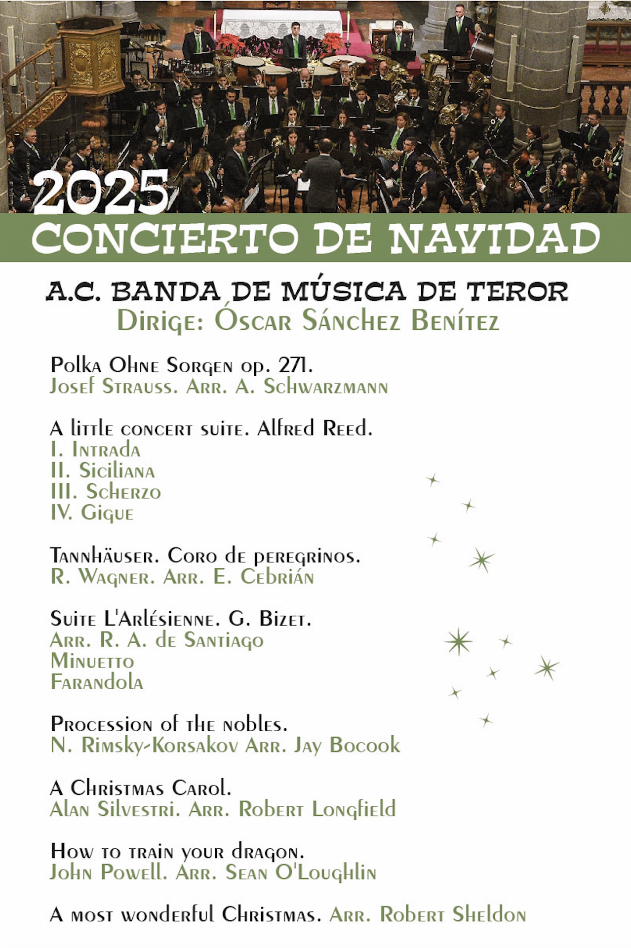 La Banda de Música de Teror ofrecerá este jueves 25 de diciembre el tradicional Concierto de Navidad, dirigido por Óscar Sánchez Benítez. La Basílica del Pino acogerá a las 20:00 horas, el esperado concierto que cada año ofrece la agrupación terorense, con entrada libre hasta completar el aforo de asientos disponibles en el templo. El programa del concierto ofrecerá ocho piezas musicales del repertorio navideño, comenzando con Johann Strauss y culminando ‘A most wonderful Christmas’.