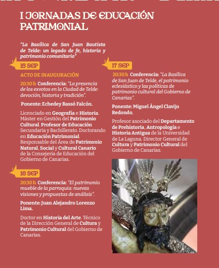 La Basílica de San Juan de Telde, el patrimonio eclesiástico y las políticas de patrimonio cultural del Gobierno de Canarias, el 17 de septiembre, a las 20.30 horas. Por Miguel Ángel Clavijo Redondo, profesor asociado del Departamento de Prehistoria, Antropología e Historia Antigua de la Universidad de La Laguna. Director General de Cultura y Patrimonio Cultural del Gobierno de Canarias.