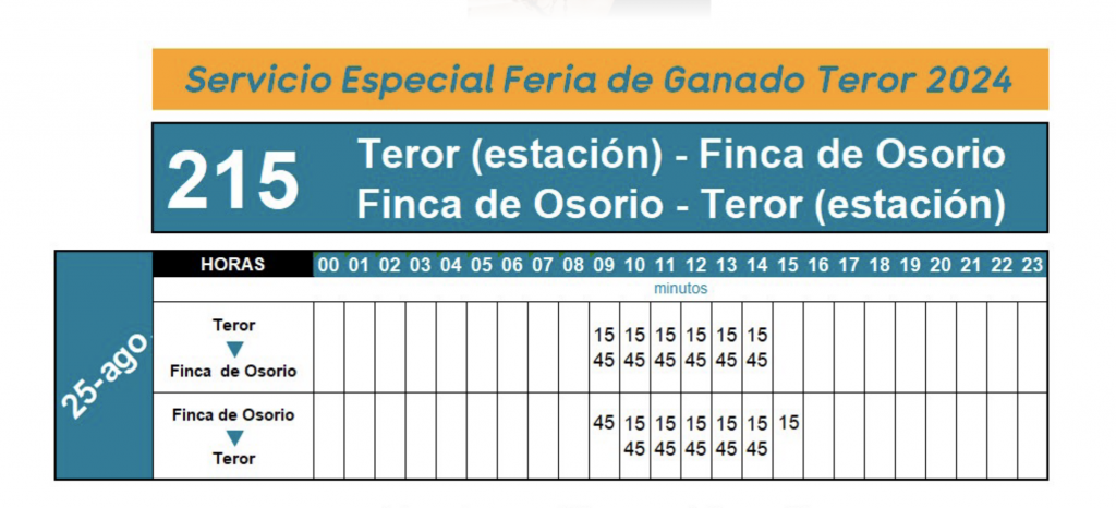 Desde el Área de Movilidad de Teror, que dirige Sabina Estévez, se informa de que la empresa de transporte GLOBAL pondrá un servicio especial gratuito de guagua el domingo 25 de agosto para trasladar desde el Casco de Teror a la Finca de Osorio, con salidas cada media hora desde la Estación de Teror. La primera guagua saldrá a las 9:15 desde Teror y la última regresará de Osorio a las 15:15 horas.