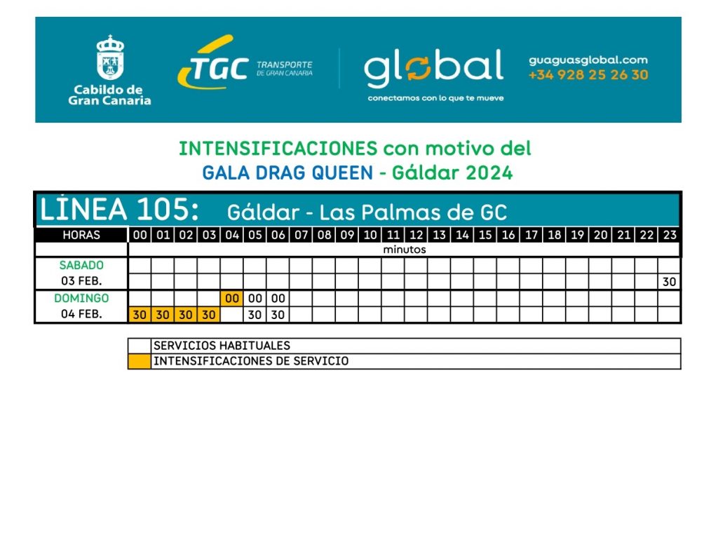 La Gala Drag Queen, que tendrá lugar el 3 de febrero en el Recinto Cultural La Quinta, estará presentada por Eva Soriano y Lara Palma con la colaboración de Drag Kiowa y Drag Vulcano y será amenizada por la música de Inna y Locomía. El Mogollón de esa noche, con un elenco de artistas aún por anunciar, se extenderá hasta las 3.00 horas. Así, Guaguas Global refuerza la Línea 105 que une Gáldar con Las Palmas de Gran Canaria. Tras el servicio habitual que arranca en la estación de Guaguas de Gáldar a las 23.30 horas se habilitarán líneas a las 00.30, 1.30, 2.30, 3.30 y 4.00 horas. Posteriormente continuará el servicio habitual de las 5.00, 5.30, 6.00 y 6.30 horas.