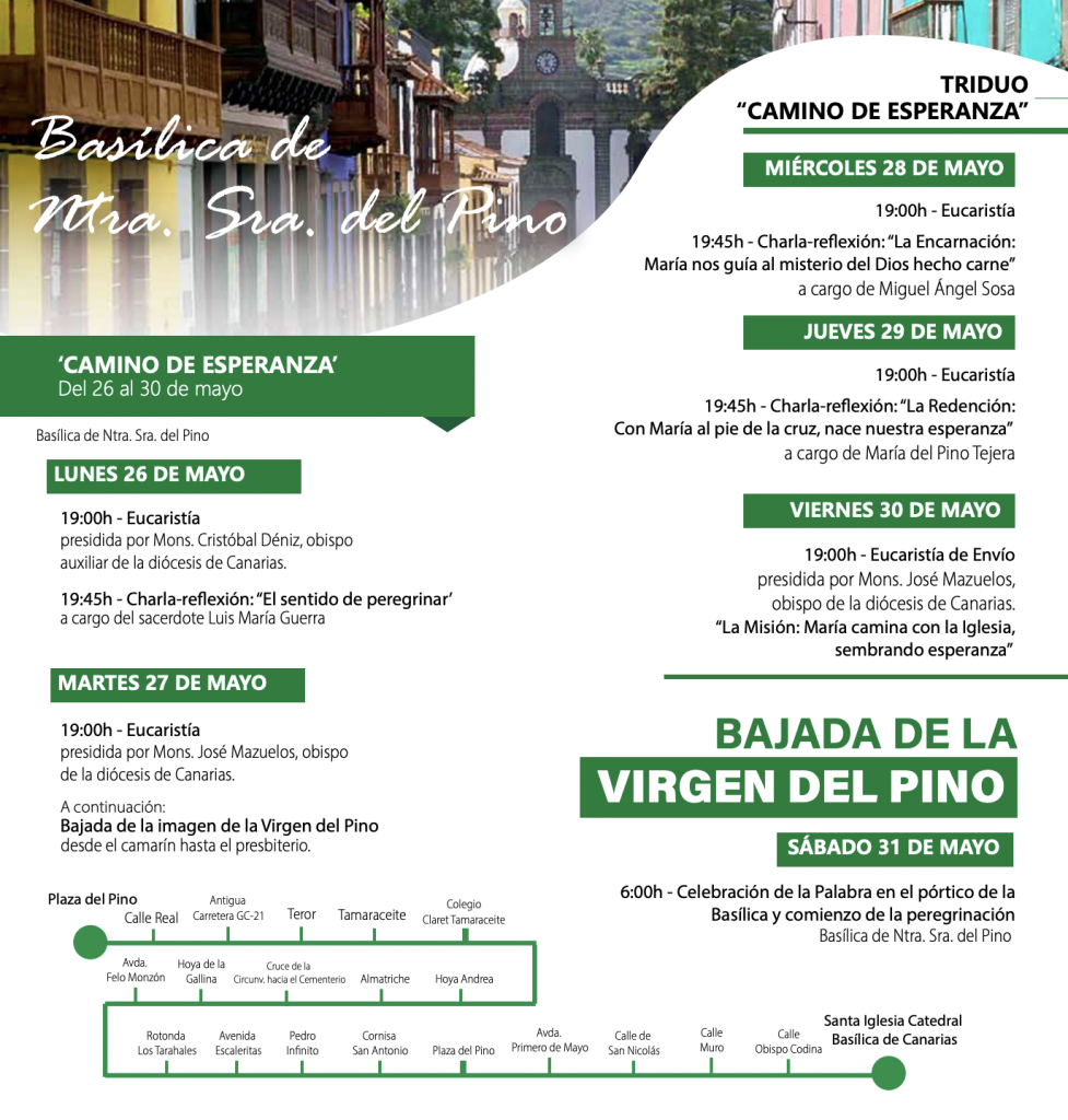 La Basilica de Teror comienza este lunes 26 de mayo la cuenta atrás para la 52ª Bajada de la imagen de la Virgen del Pino a la Catedral de Las Palmas el próximo 31 de mayo. Desde el 26 al 30 de mayo la Basílica del Pino acogerá en los días previos a la despedida distintas eucaristías y charlas-reflexión. Uno de los actos de mayor expectación será este martes 27 de mayo, tras la eucaristía presidida por el obispo de la Diócesis de Canarias, Monseñor Mazuelos, a la que seguirá el descenso de la imagen desde su camarín, ataviada con el manto blanco. DESCARGAR PROGRAMA