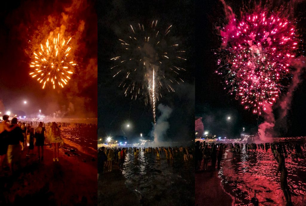 No faltó la gran hoguera, presidiendo la festividad hasta la llegada de las doce horas de la noche, momento en el que cientos de personas se adentraron en el mar, un rito para atraer la buena suerte y dejar que todo lo malo se lo lleve la marea. La exhibición de fuegos artificiales fue el punto álgido de esta celebración, que continuó con verbena de manos del Grupo Arena y nuevamente el DJ Aitor Cruz.