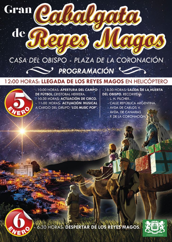 Ya por la tarde, a partir de las 18:30 horas, dará comienzo la Gran Cabalgata de Reyes, que partirá desde la Huerta del Obispo y recorrerá las calles L. H. Pílcher, República Argentina, Avenida Carlos V y Avenida de Canarias, para finalizar en la Plaza de la Coronación de La Jurada. En este punto, la alcaldesa, Vanesa Martín, hará entrega a Sus Majestades de la llave mágica que les permitirá acceder a los hogares durante la noche más especial del año. La cabalgata contará con una docena de carrozas, coches descapotables, personajes de cuentos, animales luminosos, payasos, zancudos, malabaristas, carteros reales, música y una cuidada ambientación navideña, en un desfile donde la fantasía, la luz y la ilusión serán las grandes protagonistas.